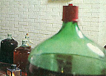 Vi fik hurtigt en ny hobby, nemlig selv at lave vin. Det foregik ved, at vi hældte æblemost og gær i nogle store 25 l glasbeholdere med en slags vandlås i proppen. Når så æblemosten gik i gæring, kom der en stadig boblen af luft gennem vandåsen - og en stedse mere liflig duft nede fra beholderen. I starten var det mest gær, det lugtede af. Hos Materialhandlen kunne kan købe små flasker med essens, alt efter om det skulle være Rhinskvin, Sauterne, rødvin etc.